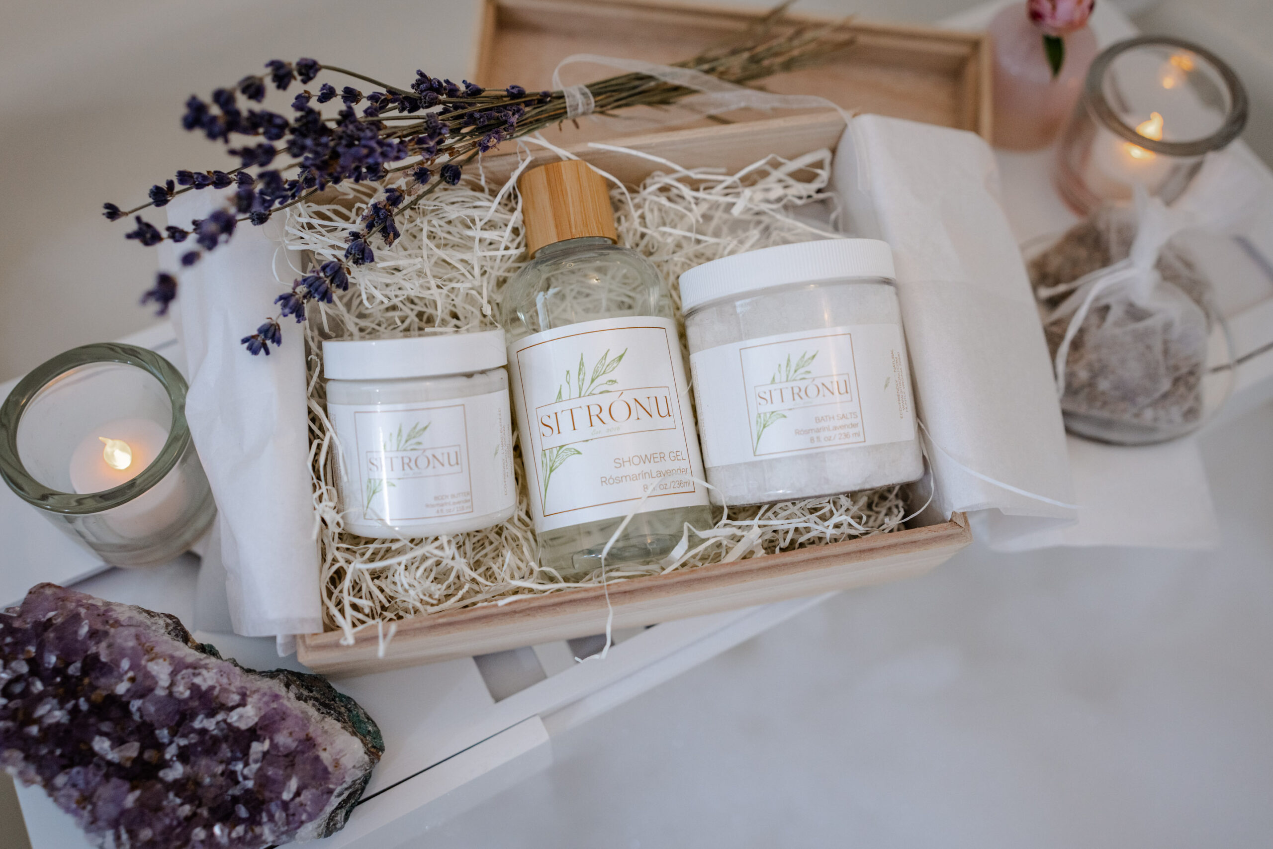 Unwind in the Blueberry Cabin with a curated bath set and wine—featuring natural products from Sítrónu and Beechwood’s private label.